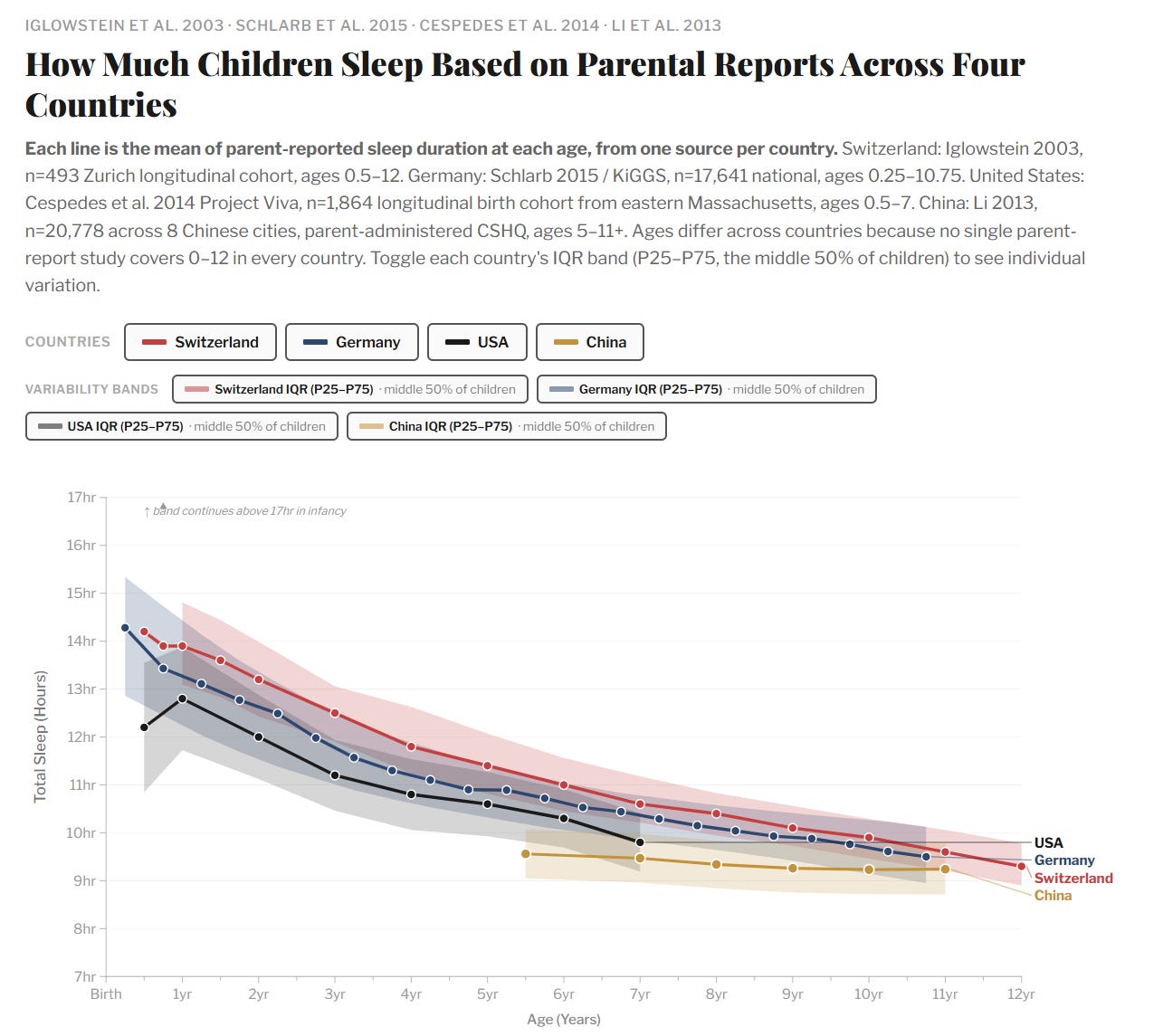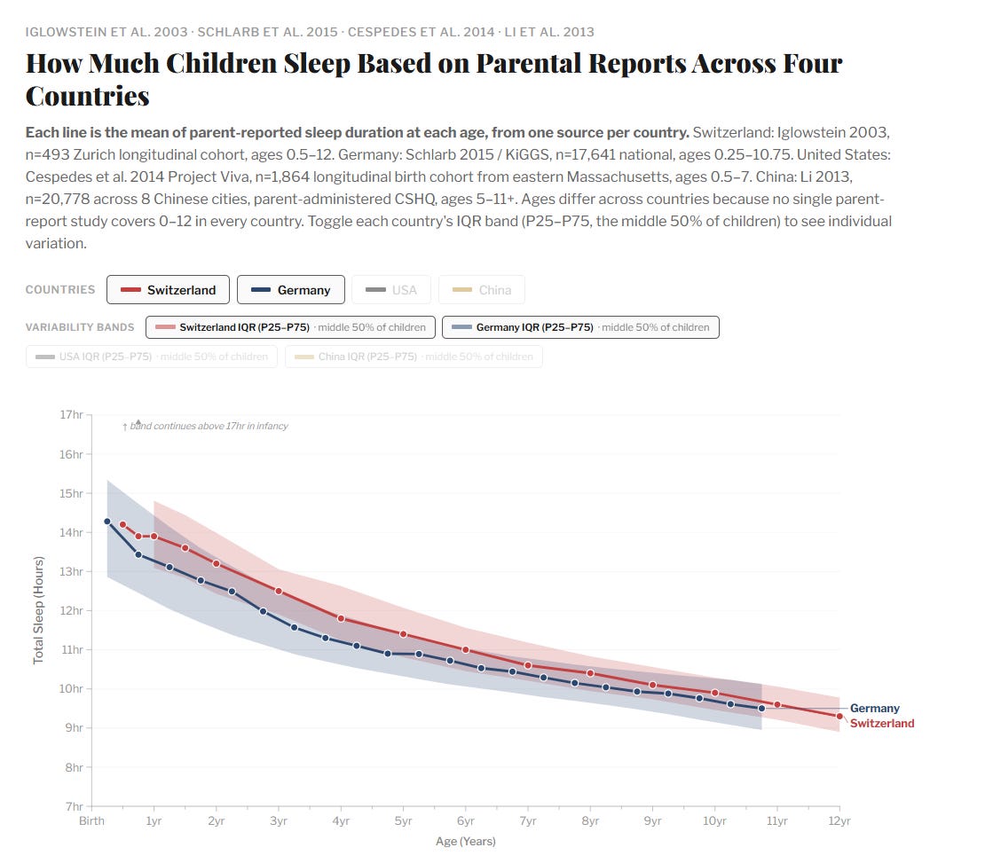 As I have continued to look at research on sleep timing and duration of children, I noticed parent-reported sleep durations published by research teams from different countries. I was interested in studies that provide fine-grained, parent-reported sleep duration data in 1-year or 1.5-year intervals rather than aggregating across wide age bands (e.g., 3 to 5 year olds, 6 to 13 year olds). Below is a visual I created comparing data from four studies of families in the USA, Switzerland, Germany, and China.