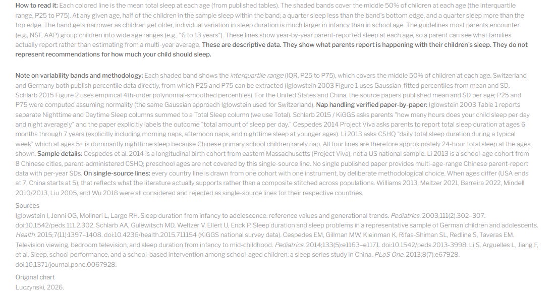 These data are descriptive, and there are differences in when and how these data were obtained. How much children sleep varies considerably depending on where and when children are raised. Cultural practices around bedtime (e.g., finishing academic work, later mealtimes, screen use near bedtime) and wake times likely contribute to these differences. This will be explored more in the future.