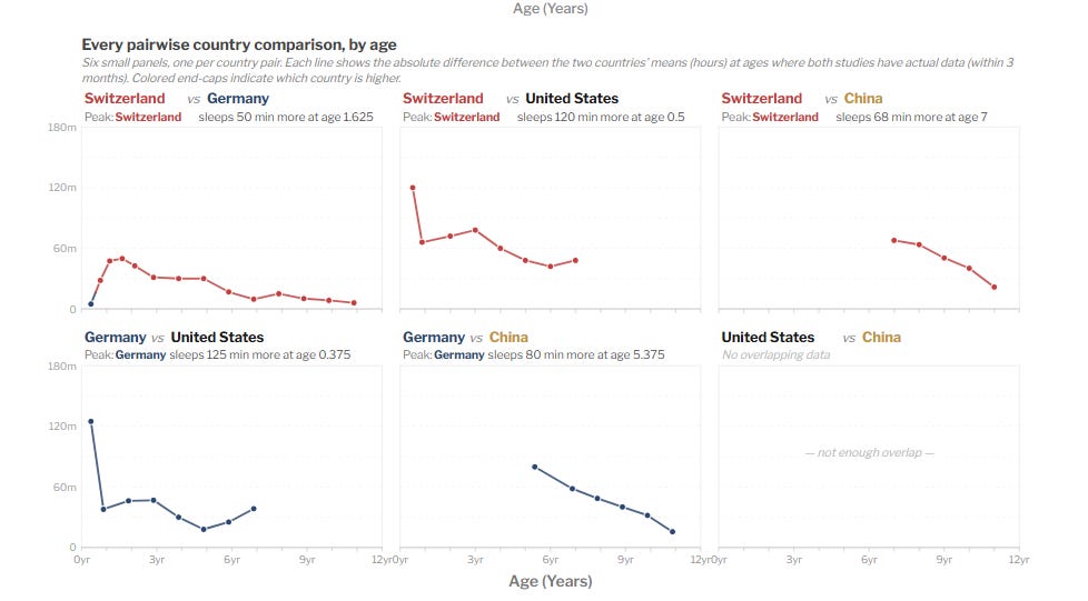 The graph above shows pairwise differences between countries at each age. For example, German children slept more than American children across all overlapping ages, as indicated by the blue data points in the bottom left panel.