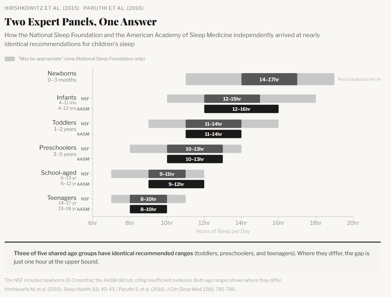 In 2015 and 2016, two independent organizations reviewed the evidence as perceived by sleep experts. The National Sleep Foundation convened 18 experts who reviewed 312 studies. The American Academy of Sleep Medicine assembled 13 experts who reviewed 864 studies. Three of five shared age groups got identical ranges. Where they differed, the gap was one hour.