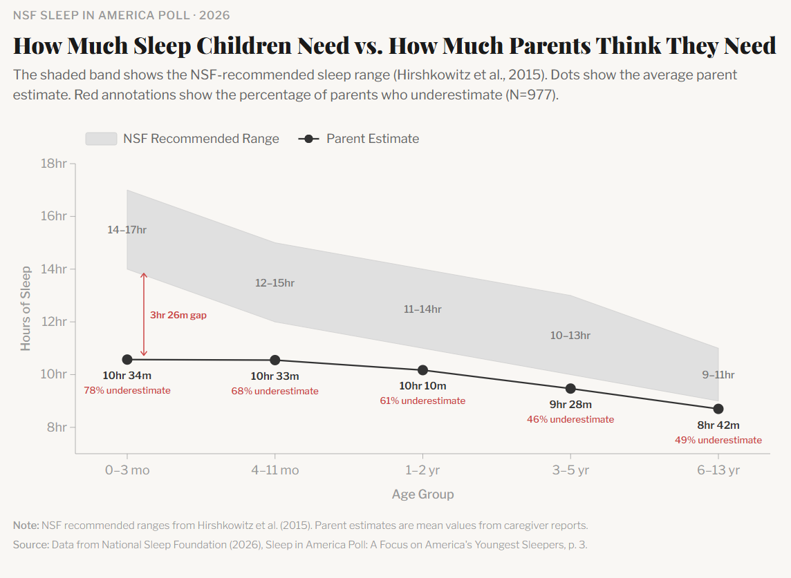 The National Sleep Foundation’s 2026 survey data used the Hirshkowitz and colleagues (2015) ranges as the benchmark when they surveyed 977 parents. They asked: How much sleep does your child need? At every age group, the average parent estimate fell below the recommended range.
