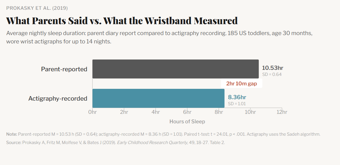 From Prokasky and colleagues (2019), parents overestimate how much their young child sleeps. When 185 toddlers wore wrist actigraphy devices for two weeks, parents overestimated their child's sleep by 2 hours and 10 minutes per night.